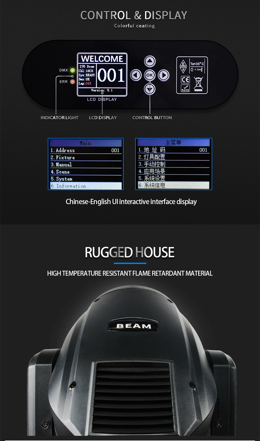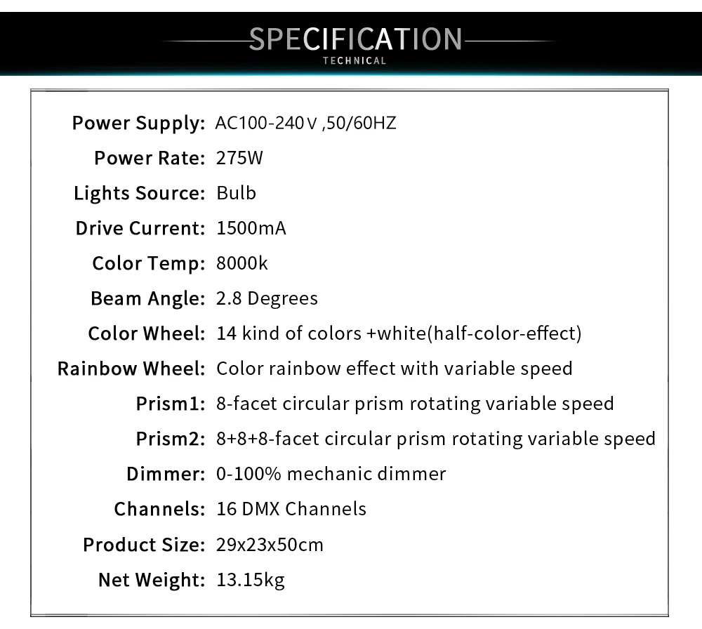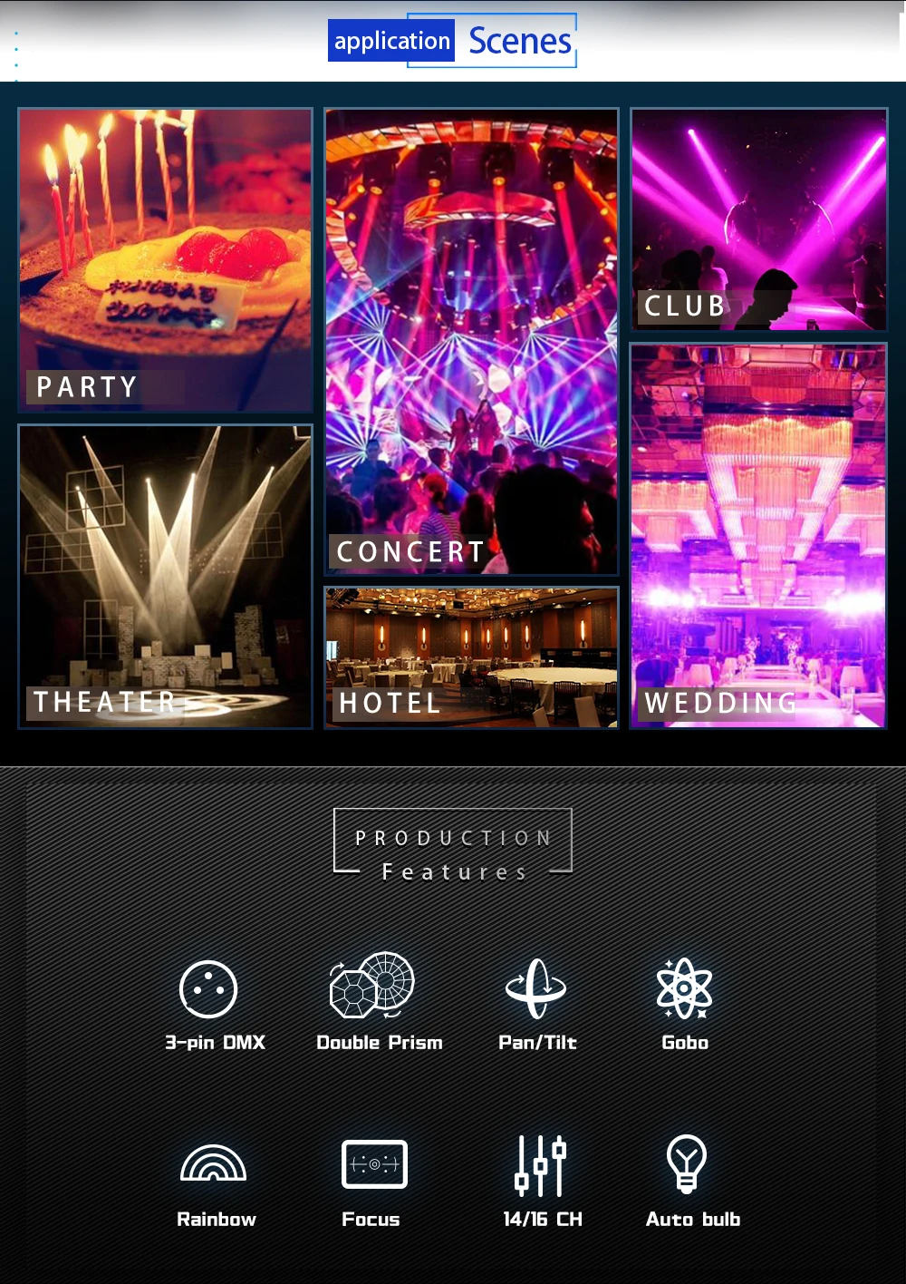 * Control Modes:DMX512,Auto Run,Sound Action,Strobe,Stand Alone and Master/Slave,With Rich Advanced Built-in Program